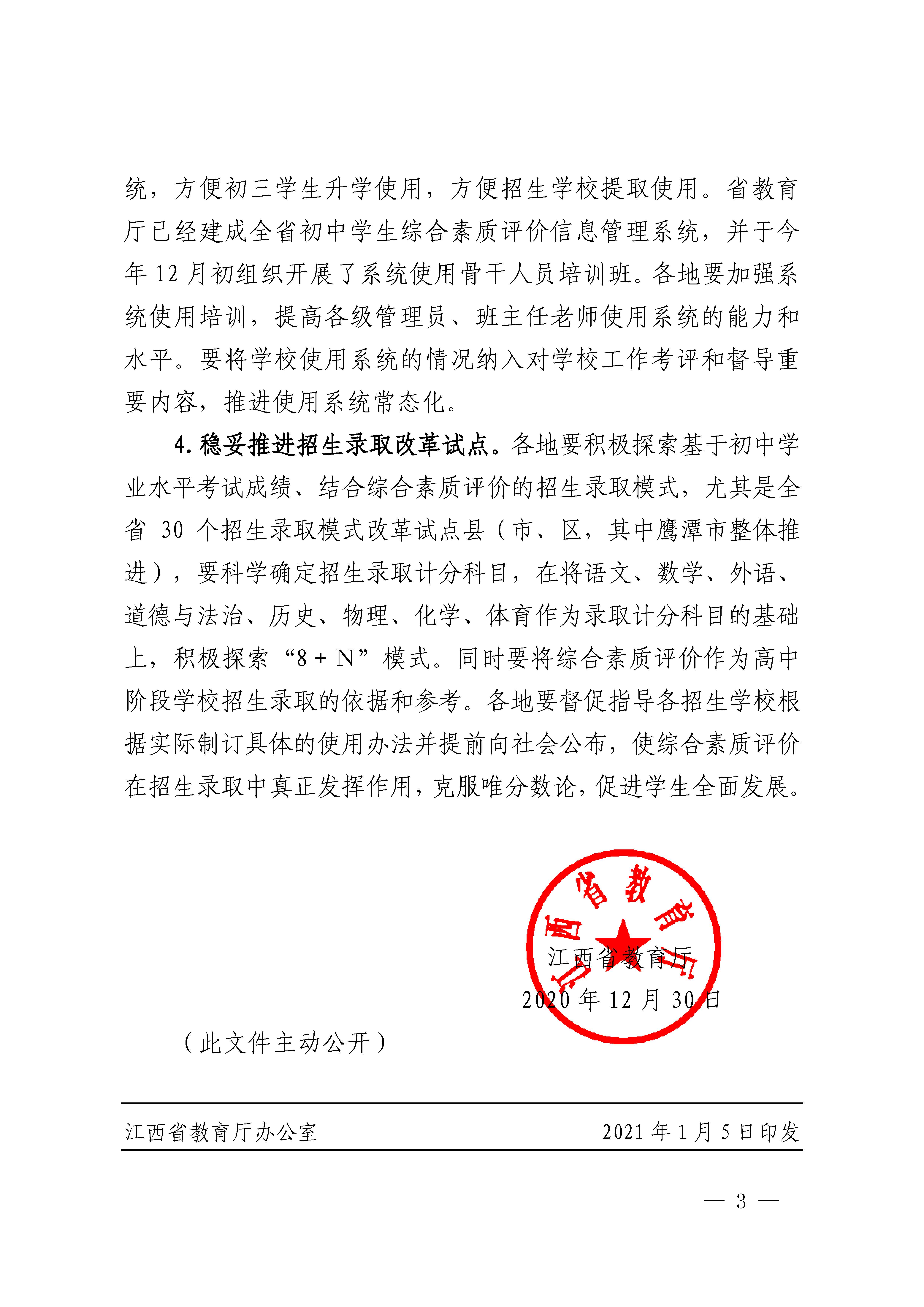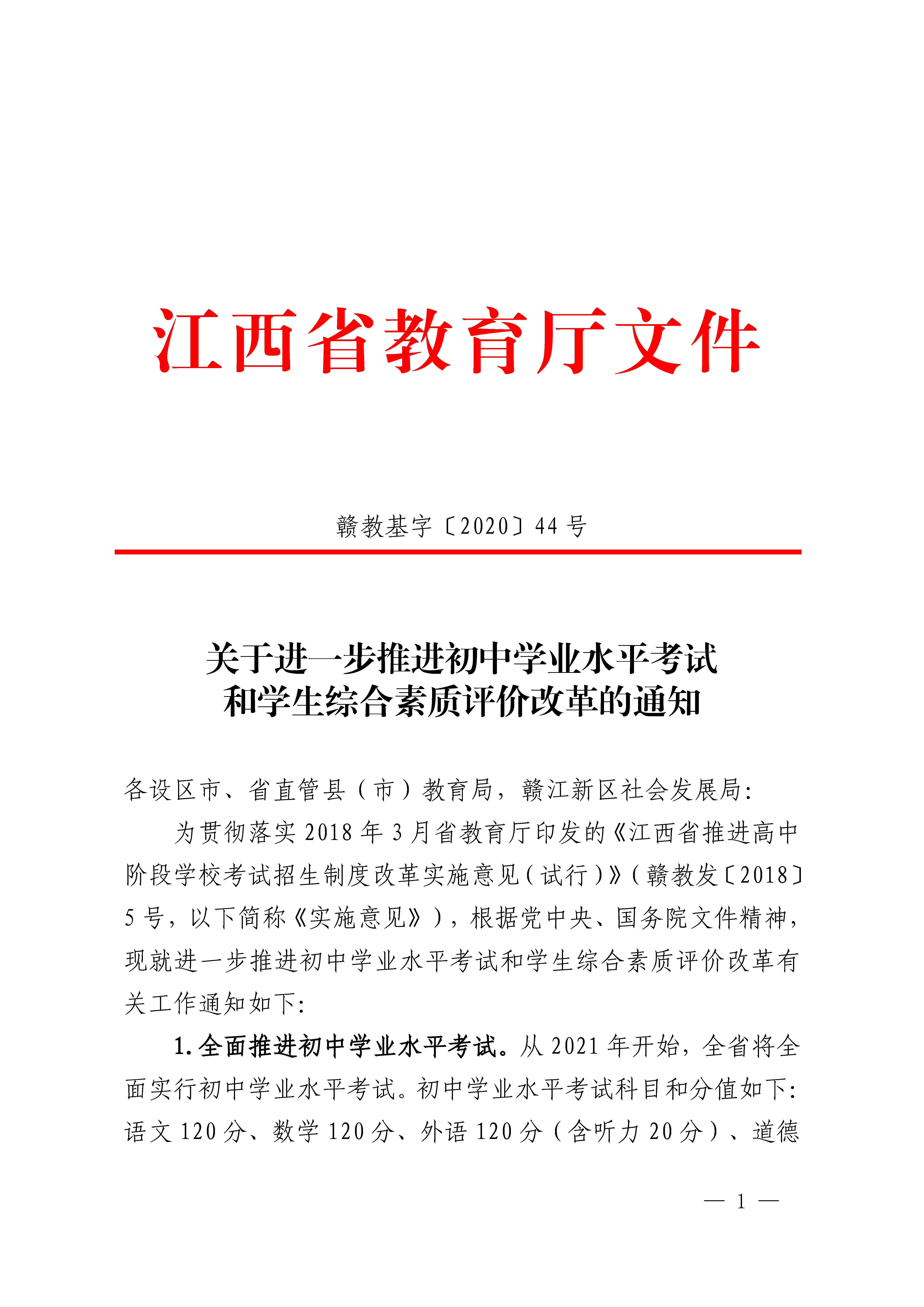 江西省教育厅《关于进一步推进初中学业水平考试和学生综合素质评价改革的通知》(赣教基字〔2020〕44号)